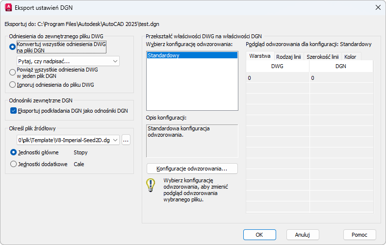 Wyświetla listę wszystkich właściwości eksportowanego pliku DWG (w kolumnie DWG) i wybranej konfiguracji odwzorowania (w kolumnie DGN).