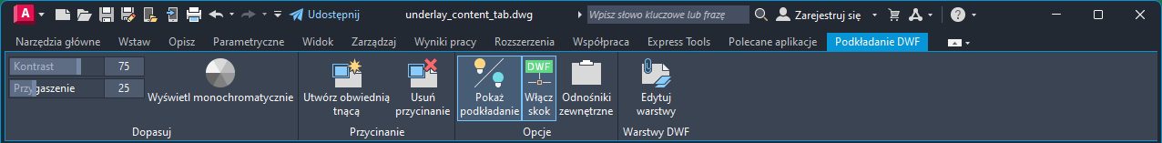 Jeśli w rysunku zostanie wybrane podkładanie DWF, na wstążce zostanie wyświetlona karta kontekstowa podkładania DWF.