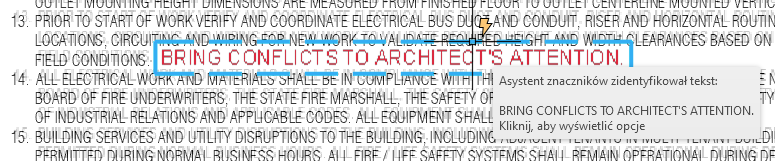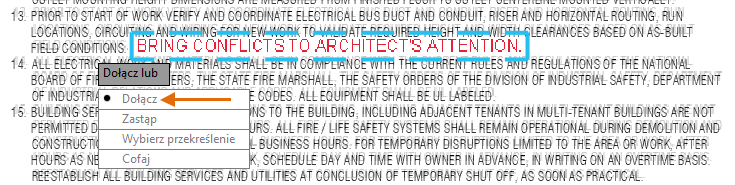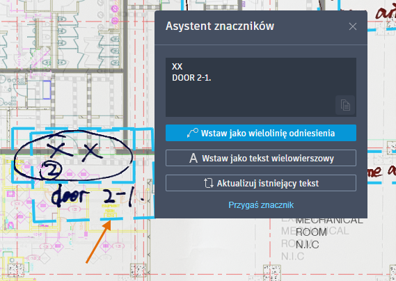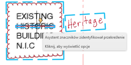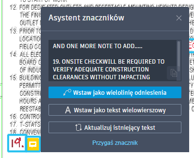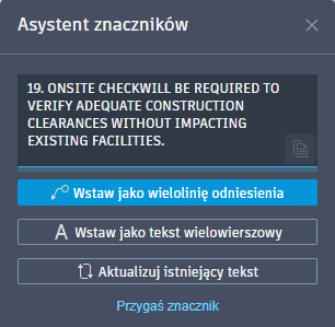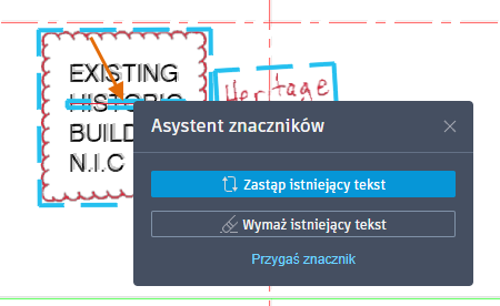 Dzięki narzędziu Asystent znaczników można przetwarzać importowane znaczniki. Asystent znaczników umożliwia identyfikację tekstu, przekreślenia tekstu, linii odniesienia, chmurek wersji, tekstu instruktażowego i komentarzy w pliku PDF. Podczas operacji na znaczniku, takich jak wstawianie chmurki wersji lub obiektu WTekst, obiekt jest dodawany do rysunku, a nie do śladu.