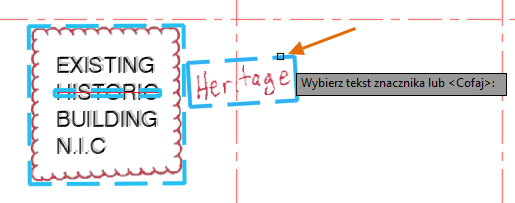 Uwaga: Jeśli nie można wybrać tekstu, naciśnij klawisz Esc, aby opuścić bieżące polecenie. Kliknij dwukrotnie wewnątrz rzutni, a następnie ponownie kliknij obwiednię znacznika.