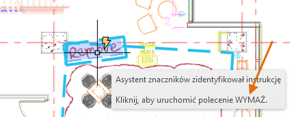 Czasami znacznik może być instrukcją wykonania czynności, np. przesunięcia lub wymazania. Jeśli narzędzie Asystent znaczników identyfikuje znacznik tekstowy jako tekst instruktażowy, podczas przetwarzania tego znacznika uruchamiane jest skojarzone polecenie programu AutoCAD. Spróbujmy.