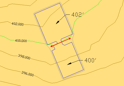 W tym przypadku należy utworzyć pobocze o szerokości 1.5 stopy wokół podstawy, a następnie nachylić je do istniejącej powierzchni gruntu o –1%. Pozornie idealnym wyborem dla obu tych zadań jest nachylenie skarpy; jednak obszar wokół rampy wymaga większej kontroli niż to jest możliwe za pomocą samego nachylenia skarpy. W poniższym przykładzie pokazano rezultat zastosowania pierwszego kryterium do tego obrysu — skarpa nachylona do odległości 1.5 stopy.