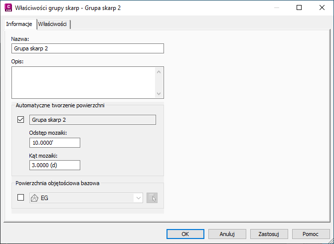 W celu rozwiązania problemu triangulacji łuku należy ustawić mniejszą wartość dla odstępu mozaikowania w grupie skarp. Jak pokazano na rysunku 26, znalezienie tej pozycji w oknie dialogowym Właściwości grupy skarpy może być utrudnione, ponieważ można ją ustawić tylko wtedy, gdy włączona jest opcja Automatyczne tworzenie powierzchni. Jednak to ustawienie używane jest również dla polecenia Utwórz odłączoną powierzchnię i triangulacji skarpy wypełnienia. Najlepszym rozwiązaniem jest włączenie opcji Automatyczne tworzenie powierzchni, wprowadzenie zmiany odstępu mozaikowania z wartości domyślnej 10 stóp na wartość 1 stopa, a następnie ponowne wyłączenie opcji Automatyczne tworzenie powierzchni. Po włączeniu opcji Automatyczne tworzenie powierzchni należy kliknąć przycisk Zastosuj w celu zastosowania zmienionych ustawień.