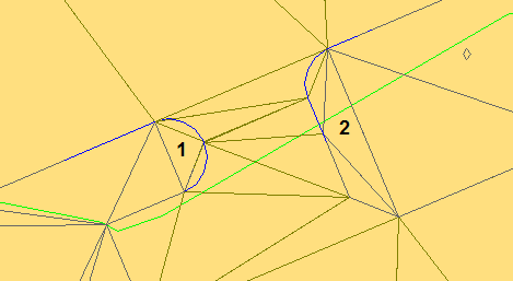 Triangulacja łuków na rampie (powierzchnia 1) jest teraz lepsza, ale trójkąty po prawej stronie (2) nie są dobrze rozłożone. Aby rozwiązać ten ostatni problem, należy do wypełnienia dodać kolejną linię charakterystyczną i użyć jej do sterowania rzędnymi w taki sam sposób, jak jest to realizowane za pomocą linii nieciągłości w przypadku powierzchni.