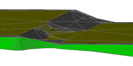 Na rysunku 24 pokazano tę samą skarpę w cieniowanym widoku 3D. Obszar szary (1) jest skarpą wypełnienia, która jest reprezentacją pobocza, obszar złoty (2) jest skarpą wypełnienia podstawy, a obszar zielony (3) jest nachyleniem skarpy do powierzchni.