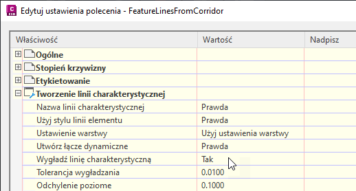 Rysunek 4: Ustawianie poleceń wygładzania linii charakterystycznych korytarza dla skarpy