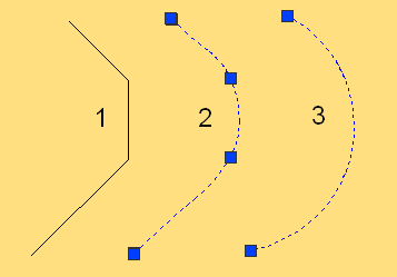 Polilinię 1 z lewej strony wygładzono do postaci łuków widocznych po prawej stronie z zastosowaniem dwóch różnych metod uwzględniających użycie poleceń edycji linii charakterystycznych, co pokazano na rysunku 2.