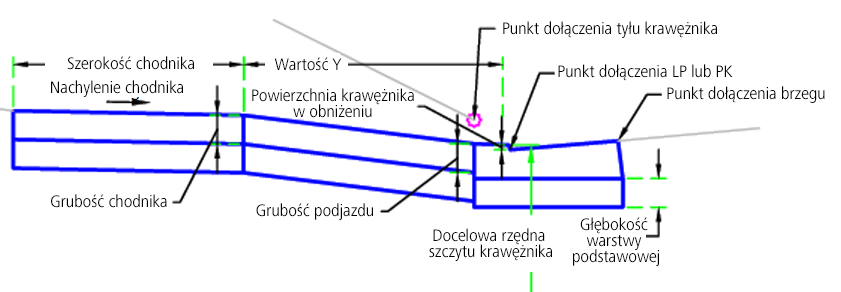 | Punkt dołączenia | Określa lokalizację punktu dołączenia krawężnika. | Brzeg/Tył krawężnika/Linia przepływu/powierzchnia | Brzeg |