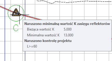 • Łuk nie spełnia minimalnej zalecanej wartości K zasięgu reflektorów. Jest wyświetlona wartość K łuku i minimalna wartość K, którą można zaakceptować.
