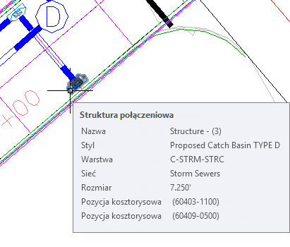 Na etykiecie narzędzi wyświetlane są opis i identyfikator pozycji kosztorysowych przypisanych do tego wpustu ulicznego.
