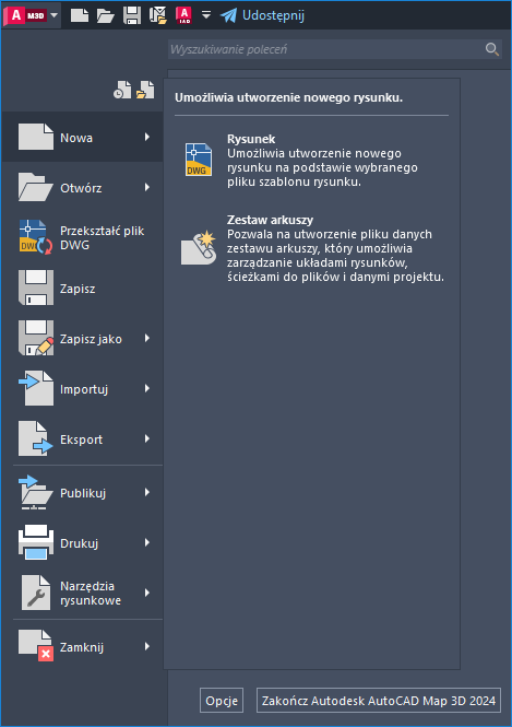 Menu aplikacji zawiera pole wyszukiwania oraz polecenia związane z plikami. Polecenie Opcje powoduje wyświetlenie okna dialogowego Opcje programu AutoCAD, w którym dostępne są ustawienia sterujące takimi parametrami, jak np. kolor tła map.