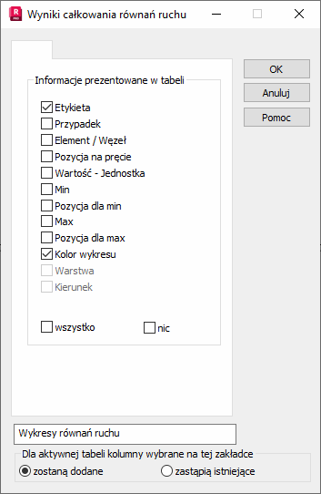 Po ustawieniu kursora w tabeli znajdującej się poniżej prezentowanych wykresów i naciśnięciu prawego przycisku myszy należy zaznaczyć kolumny, aby wybrać wielkości dla całkowania równań ruchu. Opcja jest dostępna jedynie dla całkowania równań ruchu.