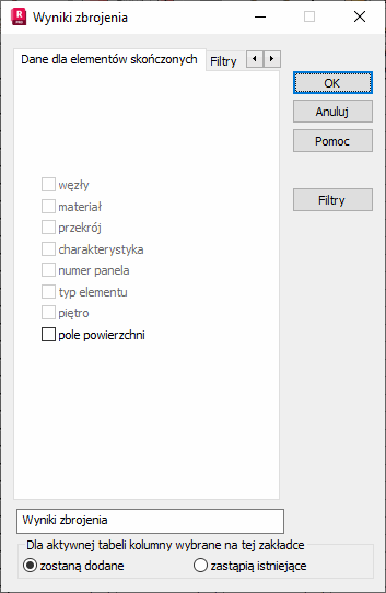 Wybierz kartę Dane dla elementów skończonych w oknie dialogowym Powierzchnie zbrojenia, aby wybrać: