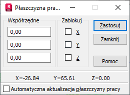 W dolnej części okna wyświetlane są aktualne współrzędne kursora. Jeśli opcja Automatyczna aktualizacja płaszczyzny pracy jest włączona, to położenie punktu pracy (a co za tym idzie i płaszczyzny pracy) zmienia się; punkt pracy jest przyjmowany jako ostatnio zdefiniowany punkt (np. koniec definiowanego pręta). Jeżeli opcja jest wyłączona, to punkt określający płaszczyznę pracy jest definiowany w powyższym oknie dialogowym (i nie zmienia się podczas definicji elementów konstrukcji).