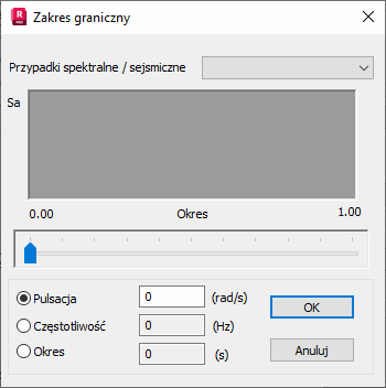 W polu Przypadki spektralne/sejsmiczne prezentowane są wszystkie przypadki analizy sejsmicznej i spektralnej konstrukcji zdefiniowane dla wybranej analizy modalnej. Po wybraniu jednej z analiz sejsmicznych lub spektralnych w górnej części okna w odpowiednim polu prezentowane jest spektrum wybranej analizy.