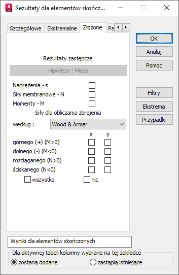 - Momenty M — Jeżeli ta opcja zostanie wybrana, to w tabeli pojawi się kolumna, w której prezentowane będą dla poszczególnych powierzchniowych elementów skończonych wyznaczone w trakcie analizy konstrukcji zredukowane momenty M.