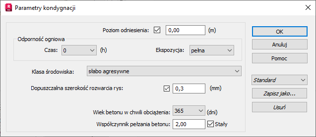 Opcja Zapisz jako umożliwia ponowne użycie zestawu parametrów kondygnacji. Zestaw jest zapisywany w bieżącym katalogu użytkownika. Można ponownie wykorzystać ten zestaw dla innego elementu w oknie dialogowym Parametry kondygnacji lub przypisać go do wybranego elementu (lub wybranych elementów tego samego typu) w oknie dialogowym Inspektor składników żelbetowych.