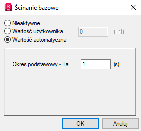 Użyj tego okna dialogowego, aby uwzględnić bazową siłę ścinającą: oblicz wartość tej siły zgodnie z przewidywaniami normy sejsmicznej (opcja Wartość automatyczna) lub podaj ją (opcja Wartość użytkownika).