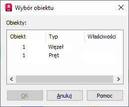 W oknie tym znajduje się wyszczególnienie wszystkich obiektów konstrukcji znajdujących się blisko miejsca kliknięcia myszą. Na pokazanym przykładzie znajduje się lista z węzłem i prętami, ale mogłyby się na niej znajdować także inne obiekty, takiej jak łuki, polilinie czy okręgi. Aby wybrać element, należy go zaznaczyć i kliknąć przycisk OK.