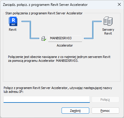 Za pomocą tej procedury można sprawdzić stan połączenia z programem Accelerator, który został przypisany do danego położenia (określonego w systemowej zmiennej środowiskowej RSACCELERATOR2025 Release) i, w razie konieczności, wybrać inny program Accelerator. Jeżeli połączenie sieciowe z programem Revit Server Accelerator zostanie utracone lub użytkownik zdecydował o niekorzystaniu z tego programu, zostanie on bezpośrednio połączony z serwerami Revit Server.