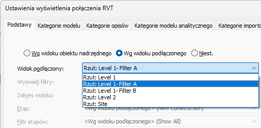- Na karcie Połączenia Revit dla podłączonego modelu wykonaj następujące czynności: