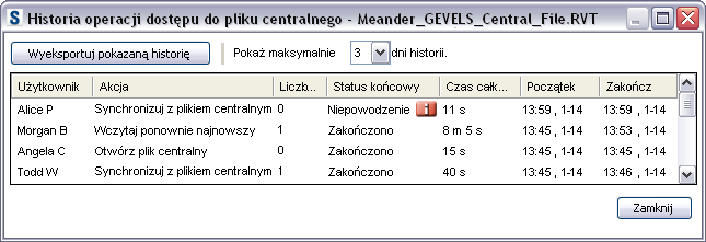 W oknie dialogowym Historia są wyświetlane informacje o wszystkich operacjach związanych z plikiem centralnym projektu. Jeśli operacja dostępu do pliku centralnego zakończy się niepowodzeniem, należy kliknąć przycisk