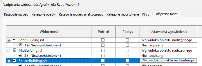 Parametry sterujące widocznością i grafiką podłączonych modeli programu Revit są zgrupowane na specjalnej karcie Połączenia Revit w oknie dialogowym Widoczność/Grafika.