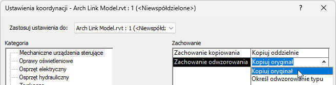 Przed skopiowaniem osprzętu z podłączonego modelu do projektu MEP lub w trakcie tego procesu określ zachowanie mapowania do każdej kategorii osprzętu w oknie dialogowym Określ ustawienia koordynacji.