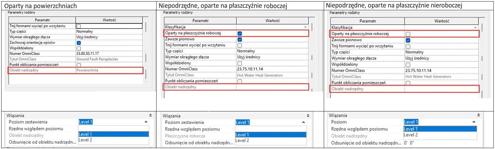 Definicja powierzchni wpływa również na to, jaka właściwość powiązana z poziomem jest dostępna. W przypadku elementów opartych na powierzchni i niepodrzędnych, opartych na płaszczyźnie roboczej istnieje wartość właściwości Poziom zestawienia. W przypadku elementów niepodrzędnych, opartych na płaszczyźnie nieroboczej nie ma właściwości Poziom zestawienia. Zamiast tego istnieje właściwość Poziom, zgodnie z podsumowaniem w następującej tabeli: