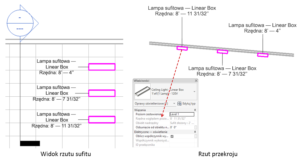 Parametru Rzędna od poziomu nie można edytować, gdy element jest umieszczony na powierzchni niepionowej, na przykład w przypadku umieszczenia gniazda w podłodze lub oprawy oświetleniowej na suficie.