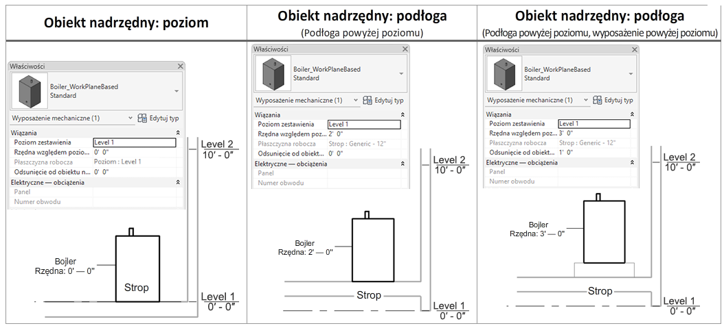 W poniższym przykładzie podłoga znajduje się na wysokości 2' 0" powyżej poziomu. Gdy bojler zostanie umieszczony na podłodze, wartość parametru Rzędna od poziomu wynosi 2' 0", a wartość parametru Odsunięcie od obiektu nadrzędnego wynosi 0' 0".