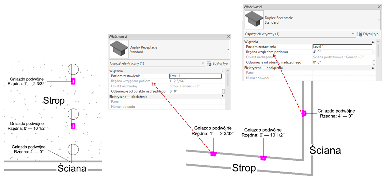 W przypadku elementów opartych na powierzchni parametr Rzędna od poziomu można edytować, gdy element jest umieszczony na powierzchni pionowej, na przykład w przypadku umieszczenia gniazda w ścianie.