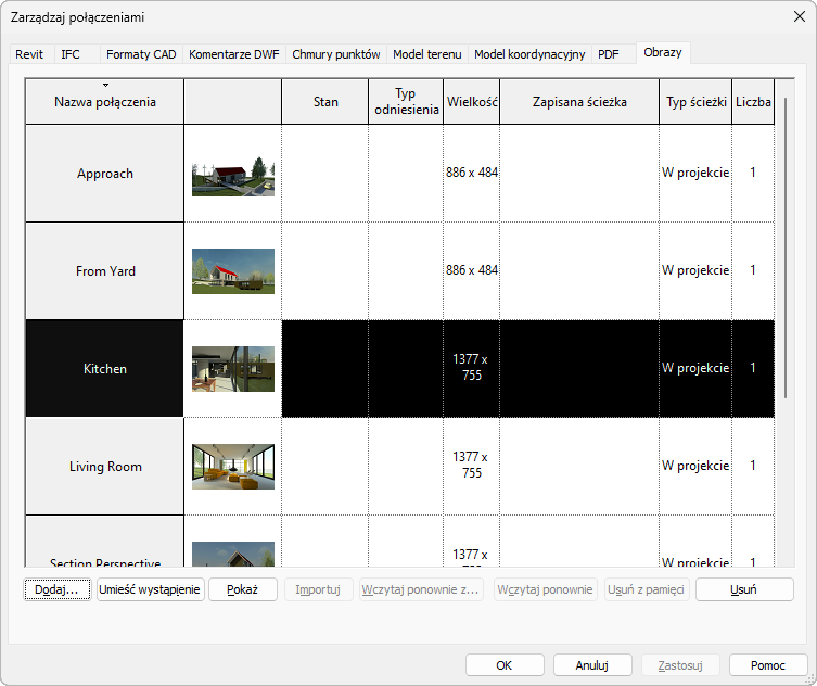 Za pomocą narzędzia Zarządzanie połączeniami można też przekazywać i zastępować istniejące połączenia i obrazy w projekcie programu Revit. Zmiany wprowadzone za pomocą narzędzia Zarządzanie połączeniami spowodują aktualizację obrazów i plików w plikach programu Revit należących do członków zespołu.