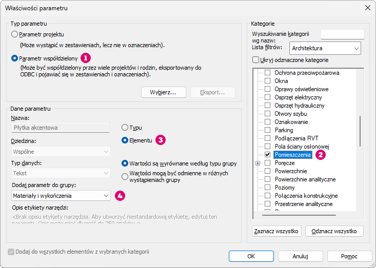 Teraz parametry współdzielone należy dodać do projektu i przypisać do kategorii Pomieszczenia. Spowoduje to wyświetlanie parametru na elementach pomieszczeń w modelu, co pozwala nadać parametrom wartości.