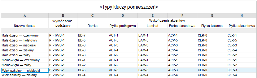Dzięki dostępności parametrów w projekcie można je dodawać jako parametry projektu, tak jak to zrobiliśmy powyżej, lub można je dodać bezpośrednio do wczytywalnej rodziny, którą wczytano do projektu. Teraz można utworzyć zestawienie kluczy. Podczas tworzenia zestawienia kluczy wybiera się parametry, które mają być kontrolowane/przypisywane za pomocą typu klucza. W tym przykładzie utworzymy typy kluczy dla każdego pakietu wykończenia pomieszczeń. Wszystkie parametry współdzielone „Akcenty pomieszczeń” zostaną dodane do zestawienia kluczy. Dodamy również wbudowany parametr wykończenia bazowego. W tym przypadku używamy go do wykończenia pomieszczenia przed dodaniem akcentów.