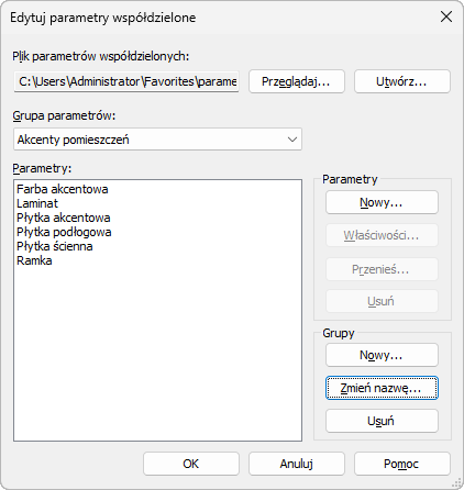 Aby uzyskać więcej informacji na temat tworzenia parametrów współdzielonych i grup parametrów, zobacz temat Tworzenie plików parametrów współdzielonych, grup i parametrów.