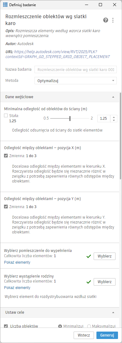 W badaniu z siatką krokową używane są elementy pomieszczenia i wystąpienia rodzin umieszczane w pomieszczeniu. W tym przypadku należy użyć rodziny zagnieżdżonej składającej się ze stolika, krzeseł i linii przerywanej wskazującej wymagania dotyczące odległości. Wybierz zmienne dla odległości między obiektami (stolikami) na osiach X i Y. Odstępy określają siatkę i położenie elementu rodziny na podstawie punktu wstawiania (początku) rodziny.