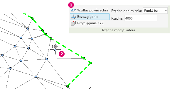 Podczas dodawania punktów w trakcie edytowania kształtu użyj ustawienia Rzędna odniesienia, aby zdefiniować względną elewację punktu. Można wybrać opcję mierzenia elewacji od bieżącego poziomu, punktu bazowego projektu, punktu pomiarowego i punktu początku wewnętrznego. Można ustalić, czy punkty są dodawane na poziomie elewacji bezwzględnej od wybranego odniesienia, czy też odsuwane o określoną odległość od istniejącej powierzchni.