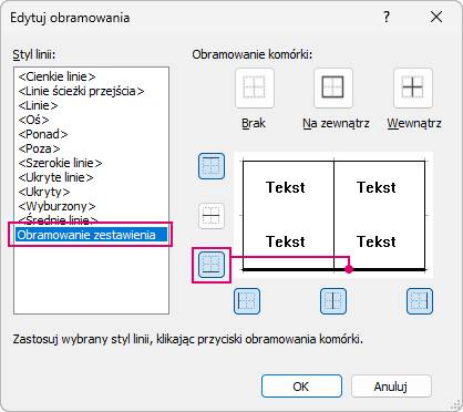 W ostatnim etapie zostaje dodane grube obramowanie, aby oddzielić nagłówek zestawienia od danych zestawienia. Kliknij i przeciągnij, aby wybrać komórki w widoku zestawienia. Kliknij opcję Obramowania na wstążce. W oknie dialogowym Edytuj obramowanie wybierz styl linii i kliknij przycisk położenia, w którym ma zostać zastosowany styl linii. W tym przykładzie tylko dolnemu obramowaniu zostaje przypisany styl szerszej linii.