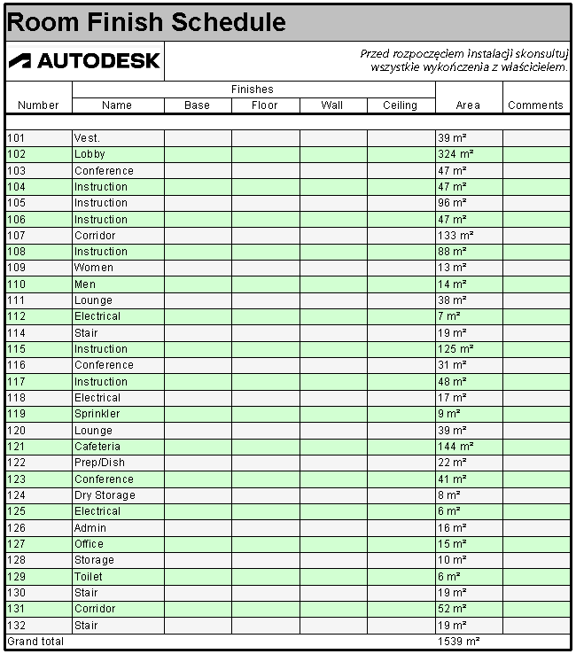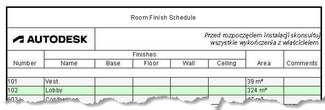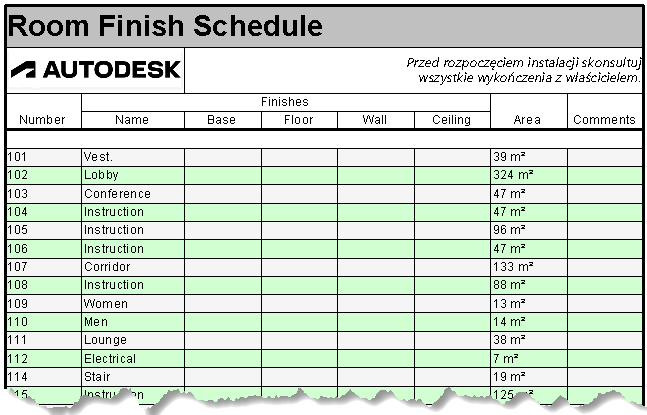 Korzystaj z narzędzi formatowania, aby jak najlepiej przekazać informacje w zestawieniu. Jeśli w widokach zestawień ma być używany standard biurowy, formatowanie zestawienia umożliwia dostosowanie domyślnego sposobu prezentacji zestawienia w programie Revit. Konfiguruj zestawienia i zmieniaj formatowanie nagłówków w plikach szablonów modeli. Po dodaniu elementów do modelu zestawienie jest sformatowane i gotowe do umieszczenia na arkuszach.