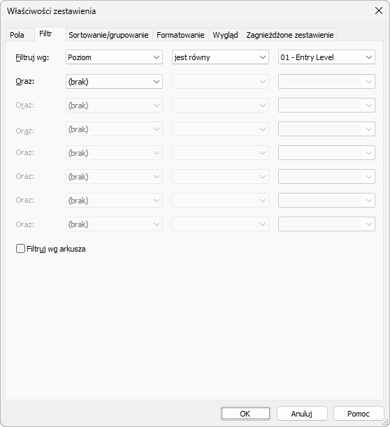 Parametr Poziom musi być uwzględniony w zestawieniu, aby filtr działał, ale nie musi być wyświetlany. Kliknij przycisk Ukryj na wstążce, aby ukryć kolumnę Poziom.