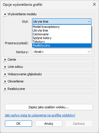 Najprostszym sposobem ustawienia stylu widoku jest wybranie opcji Pasek sterowania widokiem w dolnej części ramki widoku. W poprzednich wersjach ustawienie widoku Realistyczny powodowało zastosowanie zasobów wyglądu do elementów w widoku. Od wersji Revit 2021 ustawienie stylu wizualnego Realistyczny powoduje zastosowanie zasobów wyglądu do elementów w widoku oraz ustawień oświetlenia (położenie słońca, kontrola ekspozycji, sztuczne oświetlenie). Można również ustawić styl wizualny w oknie dialogowym Opcje wyświetlania grafiki lub zastosować do widoku szablon widoku.