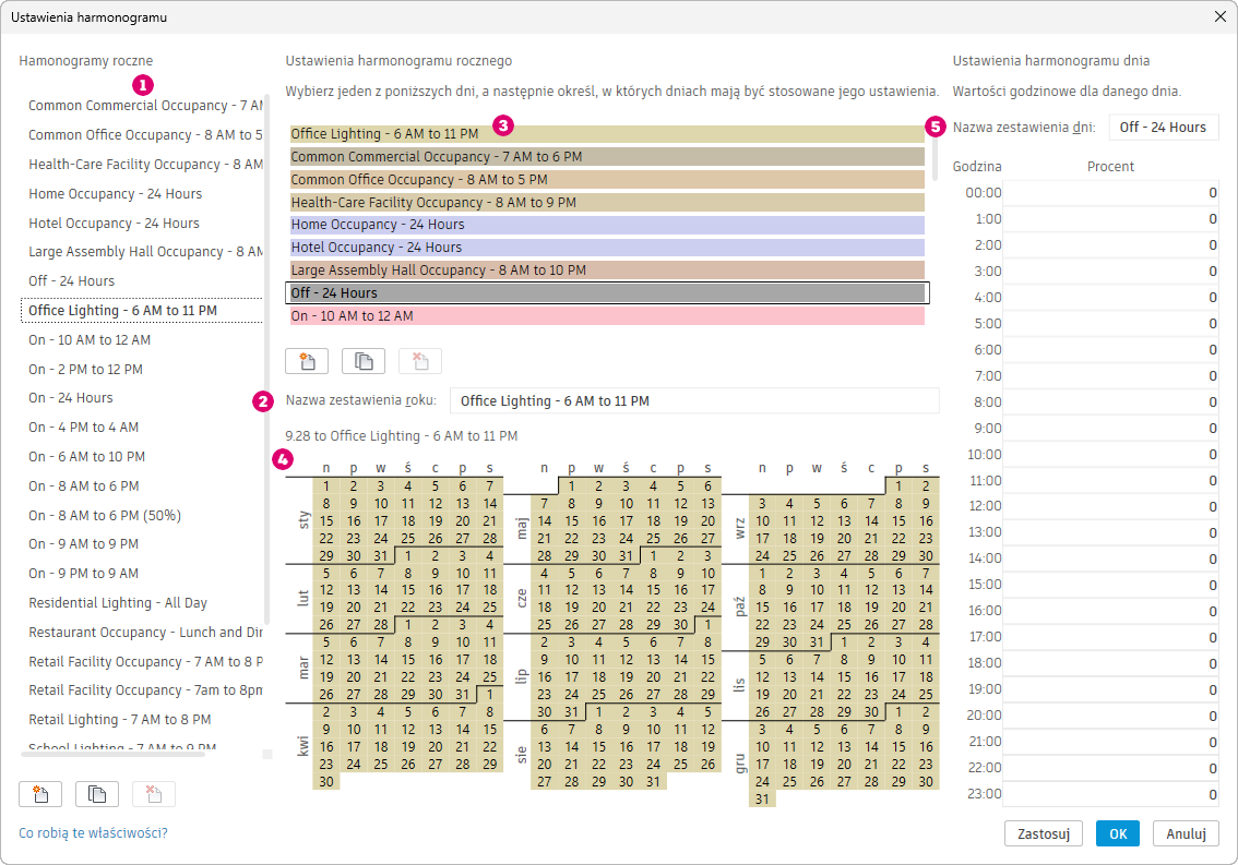 Można wybrać użytkowanie, oświetlenie i zestawienia zasilania dla danego typu budynku i pojedynczych pomieszczeń w modelu.