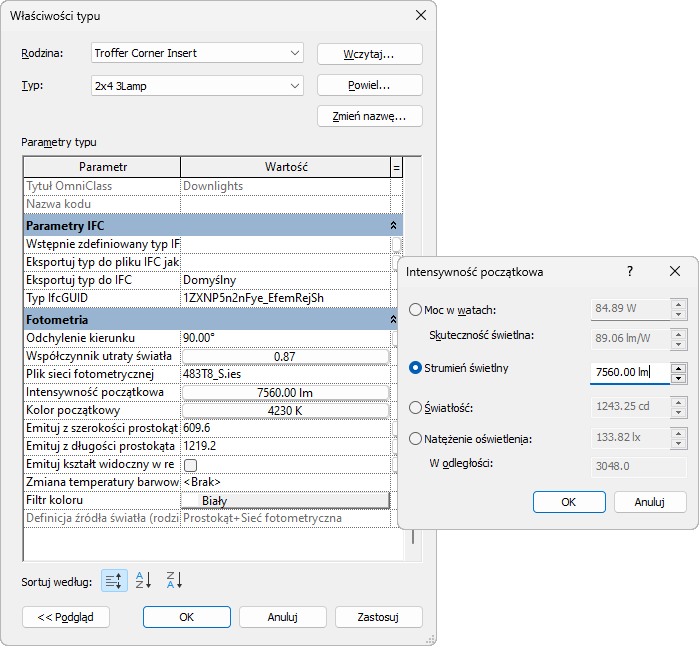 Intensywność początkowa i współczynnik utraty światła są właściwościami typu danego typu oprawy oświetleniowej. Właściwości te są dostępne w oknie dialogowym Właściwości typu oprawy oświetleniowej.