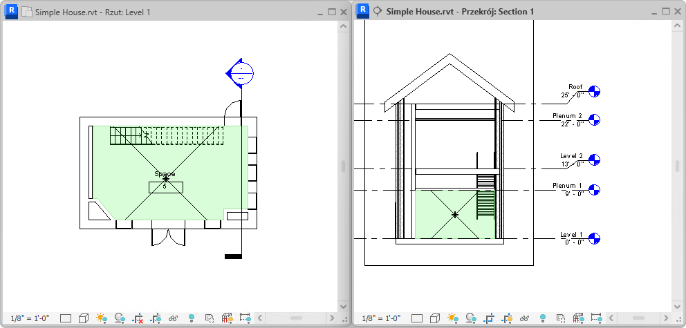 - Zamknij wszystkie widoki z wyjątkiem widoku przekroju i rzutu kondygnacji, w którym chcesz umieścić przestrzeń, a następnie wpisz w t na klawiaturze, aby umieścić sąsiadująco dwa widoki.