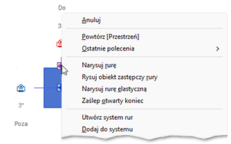 Dodawanie z menu kontekstowego: umieść wskaźnik myszy na złączu rury na rodzinie osprzętu lub sprzętu i kliknij prawym przyciskiem myszy, aby wyświetlić menu kontekstowe. Kliknij opcję Rysuj rurę, aby dodać rurę oraz odziedziczyć rozmiar i rzędną ze złącza. Ta rura będzie mieć typ systemu przypisany do tej samej klasyfikacji systemu co złącze. Tej metody można też używać w widoku elewacji lub przekroju.