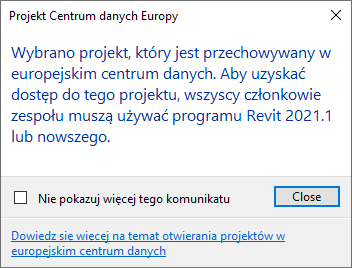 Przyczyna: w wersjach programu Revit wcześniejszych niż 2021.1 nie można połączyć się z lokalizacjami w europejskich centrach danych, więc użytkownicy poprzednich wersji programu Revit muszą wybrać projekt w centrum danych w Stanach Zjednoczonych. Po wybraniu projektu programu Plant 3D przechowywanego w europejskim centrum danych w programie Revit 2021.1 użytkownicy wcześniejszych wersji programu Revit nie mogą połączyć się z tym projektem.