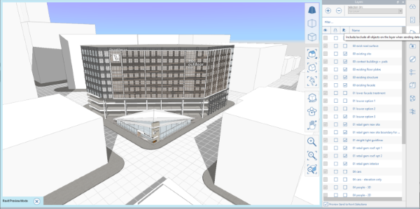 Wyświetl podgląd geometrii i warstw w programie FormIt, które zostaną wysłane do programu Revit, aby mieć lepszą kontrolę nad zawartością, która zostanie odesłana. W programie FormIt włącz tryb podglądu, używając pola wyboru Podgląd wysyłania do wyborów programu Revit w panelu Warstwy. Niebieska ramka wskazuje, że tryb podglądu programu Revit jest włączony. Nowa kolumna w panelu Warstwy wskazuje, które warstwy zostaną przeniesione do programu Revit w ramach łączenia z plikiem AXM lub podczas korzystania z procesu roboczego szkicowania 3D — Wyślij do programu Revit.