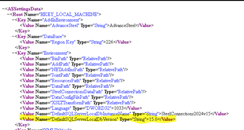 - Otwórz plik <ścieżka instalacji programu Revit 2023>\AddIns\SteelConnections\ASSettings_Advance.xml i dodaj następującą wartość w obszarze klucza Environment: <Value Name="DefaultSQLServerLocalDbVersion" Type="String">%żądana wersja narzędzia SqlLocalDB%</Value>.