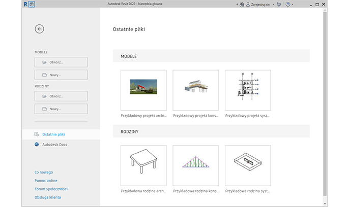 Narzędzia główne programu Revit mają też zmodernizowany styl wizualny zgodny ze standardem Autodesk obejmującym zoptymalizowaną architekturę informacji, w tym łącza do zawartości, przycisk odświeżania i przejście do usługi Autodesk Docs.